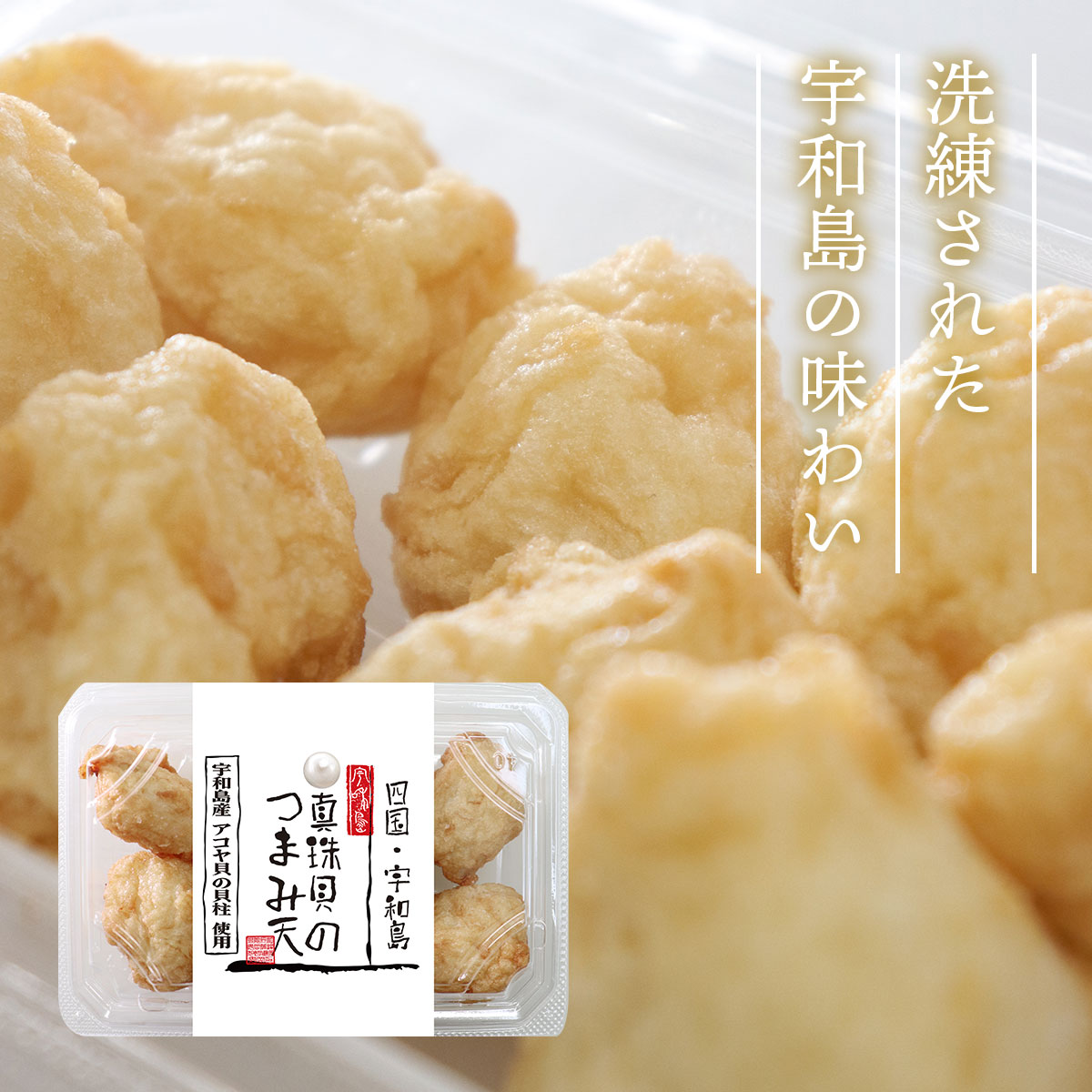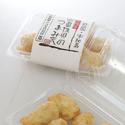 安岡蒲鉾の人気商品「宇和島身天」のすり身をベースに、宇和島産の真珠貝の貝柱をたっぷり練り込んだ「真珠貝のつまみ天」。一口サイズながら、噛むたびに豊かな香りと上品な旨みが広がります。