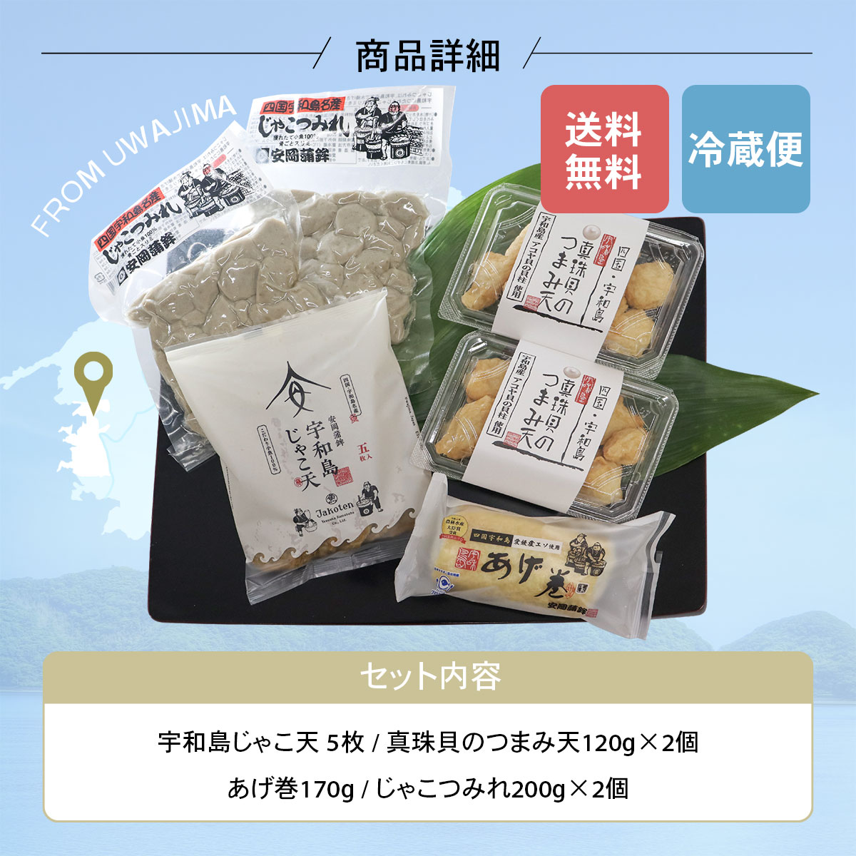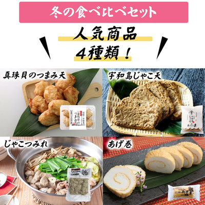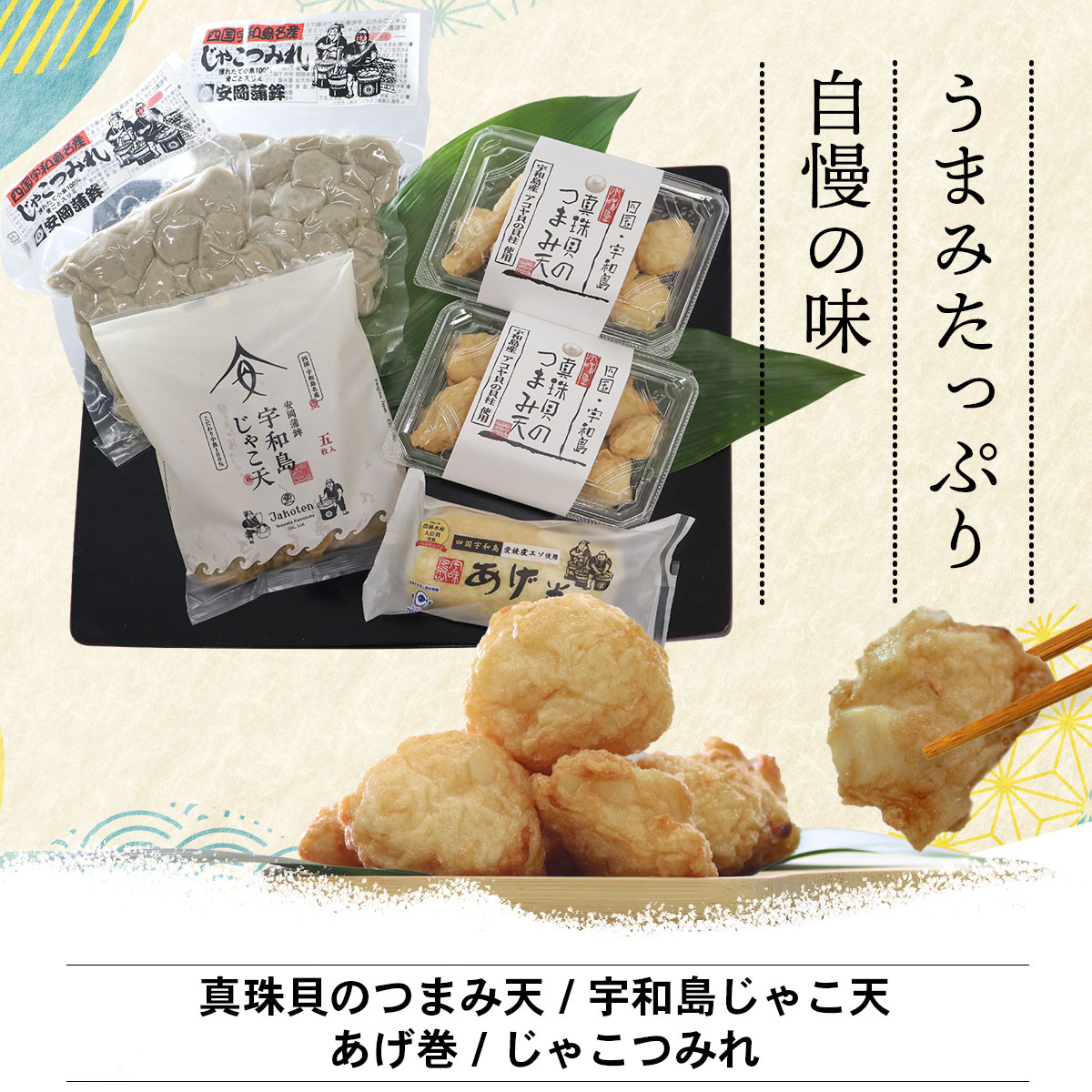 冬にぴったりの魚のおいしさが詰まった贅沢セット。 お鍋やスープにぴったりのじゃこつみれ、濃厚な旨みの真珠貝つまみ天、定番のじゃこ天、そして風味豊かなあげ巻。 ご家族やご友人と楽しむ冬の食卓におすすめです。